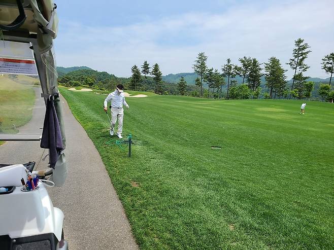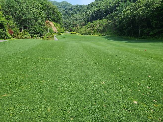 양잔디 페어웨이로 관리는 잘 되어있는 편입니다. 길이는 약간 더 짧게 깎아도 될듯했으나 대체로 공이 잔디 위에 잘 올라있네요. 디봇 관리도 한 흔적이 보입니다.