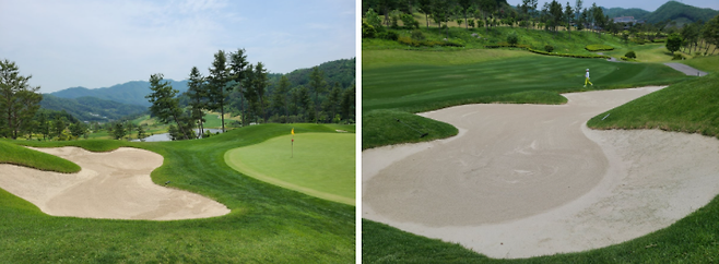 페어웨이 벙커는 블루 티에서 약 210~230미터 전방에 위치합니다. OB로 빠질 수 있는 공을 잘아줄 수 있도록 배치되었다는 느낌이 들었습니다. 그린 주변 벙커는 턱이 높은 편이고 사이즈도 큰 편입니다. 모래도 부드러워서 높은 어프로치 샷이 짧을 시, 모래에 플러그 되는 위험도 있네요.
