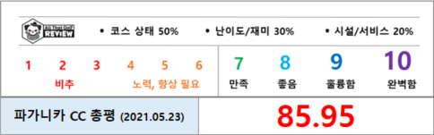 · 골프장: 파가니카 CC · https://paganica.kmhleisure.com/paganica/ · 날짜 및 티타임: 2021.05.23일 · 티 박스: 화이트 티 · 비용: 그린피 16.9만 원 + 카트비 10만 원 · 캐디: 13만 원