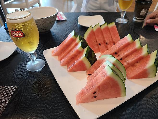 전반 끝나고 약 30분이라는 긴 시간을 보내야 했네요. 수박은 서로 다투지 않게 4인분으로 나오는 센스.