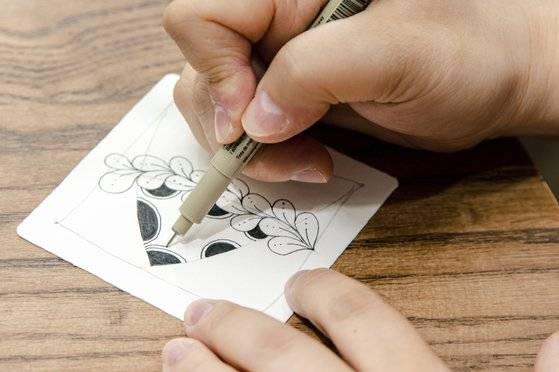 A : 강의하면서 가장 많이 받은 질문이 ‘젠탱글 배워서 어디에 쓰나요?’예요(웃음). 젠탱글은 그리는 과정에 중점을 둔 자기발견의 여정이자, 삶을 컨트롤할 수 있는 기술·도구예요. 딱히 어디에 사용하지 않아도 그리는 것만으로 충분히 가치를 발휘하죠. 좀 더 구체적으로 말하면, 패턴과 그림이 쓰이는 곳이라면 어디든 활용 가능합니다. 옷·스카프 같은 패브릭, 도자기, 타일, 문구류를 포함한 모든 디자인 분야에 젠탱글이 들어갈 수 있고, 여러분이 좋아하는 다이어리 꾸미기에도 젠탱글 메소드를 적용할 수 있죠.