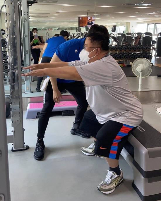사진 속 이용식은 트레이너의 지도를 받으며 운동을 하고 있다. 이수민은 그런 아빠의 모습을 사진으로 담고 있다.