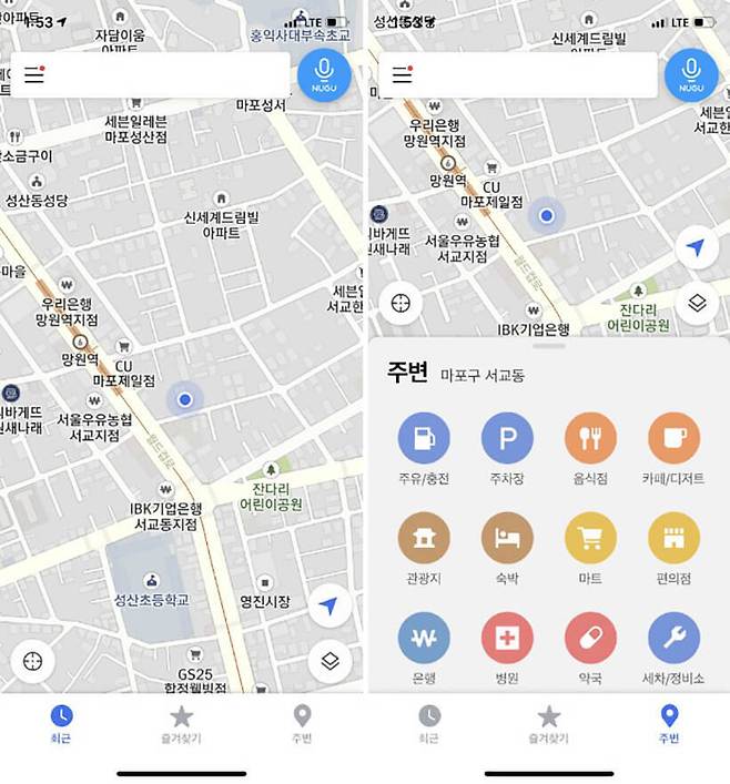 먼저 네이버지도에서 주변 맛집을 찾아보도록 하자. 네이버지도 앱을 실행하고 화면 하단에서 [주변]을 선택하면 현재 위치와 함께 네이버 스마트 어라운드가 추천하는 주변 맛집을 확인할 수 있는데, 이때 화면을 아래에서 위로 스와이프하면 하나의 화면에서 더 많은 맛집을 볼 수 있다.