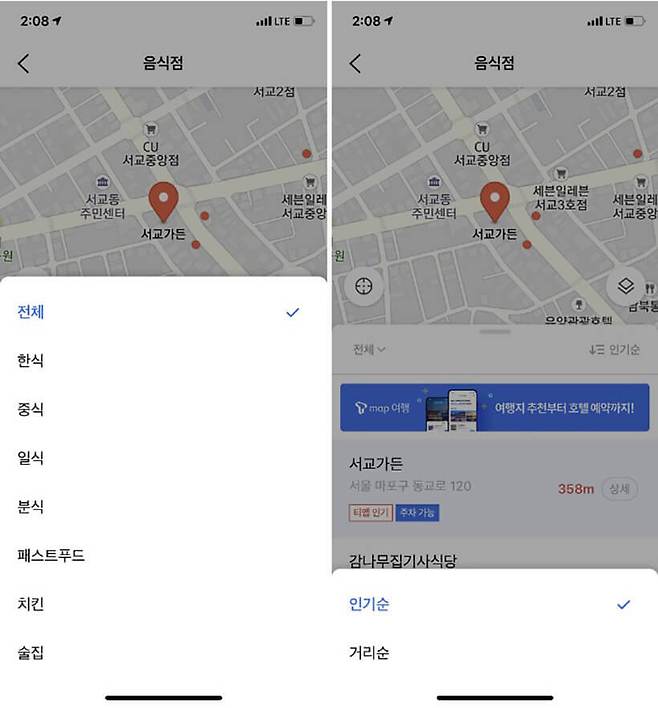 카카오맵처럼 식당을 카테고리별로 확인할 수도 있다. [전체]라고 쓰여진 부분을 선택하면 한식, 중식, 일식, 분식, 패스트푸드, 치킨, 술집으로 카테고리를 나눠 확인할 수 있는데, 카테고리가 카카오맵에 비해 세분화되어 있어 더 쉽게 마음에 드는 식당을 찾을 수 있다. 또한 [인기순]이라고 쓰여진 부분을 선택하면 추천 맛집 리스트를 거리순으로 변경할 수 있어 가까이에 있는 맛집을 검색할 수도 있다.