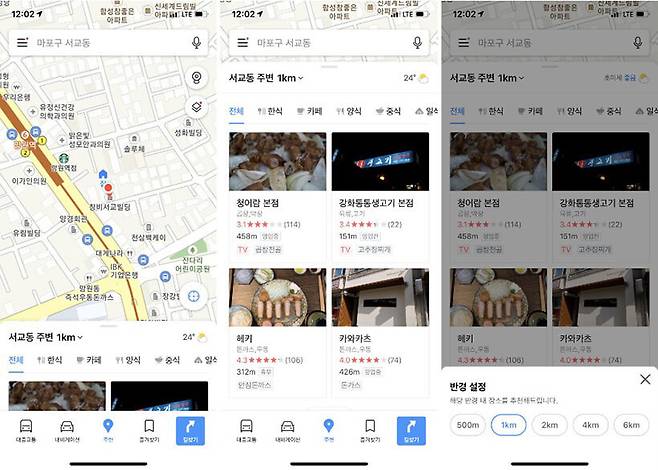 이번에는 카카오맵에서 주변 맛집을 찾아보도록 하자. 전체적인 방식은 네이버지도와 비슷하다. 앱을 실행하고 화면 하단에서 [주변]을 선택한 다음, 화면을 아래에서 위로 스와이프하면 주변 1㎞에 위치한 맛집을 확인할 수 있다. 여기서 [1㎞]라고 쓰여진 부분을 선택하면, 반경을 최소 500m에서 최대 6㎞로 변경할 수 있다.