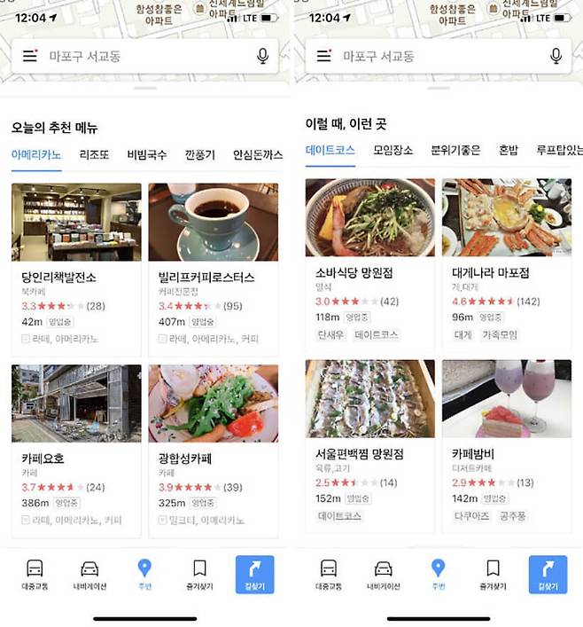 다만 네이버지도와 차이점이 있다면 주변 맛집을 카테고리별로 확인할 수 있다는 것이다. 네이버지도에서는 카페, 베이커리, 한식, 양식 등의 맛집이 모두 한 화면에 표시되었다면, 카카오맵에서는 한식, 카페, 양식, 중식, 일식으로 카테고리를 나눠 맛집 리스트를 확인할 수 있다. 또한 맛집마다 평점과 거리, 주요 메뉴, 특장점(가족모임, 주차 등)이 표시되어 더 수월하게 상황에 맞는 맛집을 찾을 수 있으며, 여러 개의 맛집이 바둑판식으로 표시되어 스크롤을 많이 내리지 않고도 금세 마음에 드는 맛집을 찾을 수 있다.