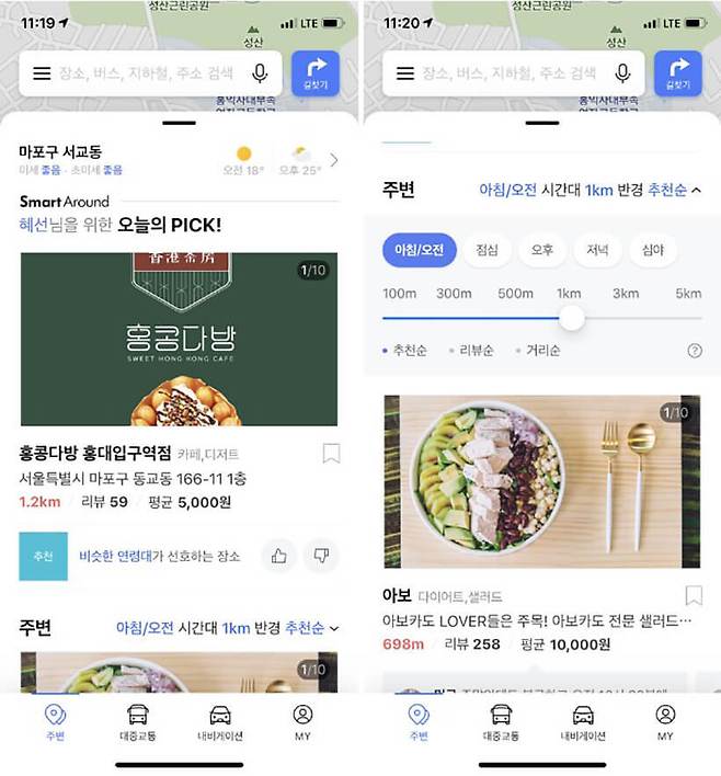 그렇다면 네이버 스마트 어라운드는 어떤 기준으로 주변 맛집을 추천해줄까? 우선 가장 상단에는 비슷한 연령대가 추천한 맛집이 표시되고, 그 아래에는 현재 시간대에 가볼 만한 1㎞ 반경의 맛집이 추천순으로 표시된다. 만약 다른 시간대에 가볼 만한 식당을 찾고 있다면 [아침/오전]이라고 쓰여진 텍스트를 눌러 시간대를 변경할 수 있으며, 반경을 최소 100m에서 최대 5㎞로 바꾸거나, 추천 맛집이 리뷰순 또는 거리순으로 표시되도록 변경할 수도 있다.