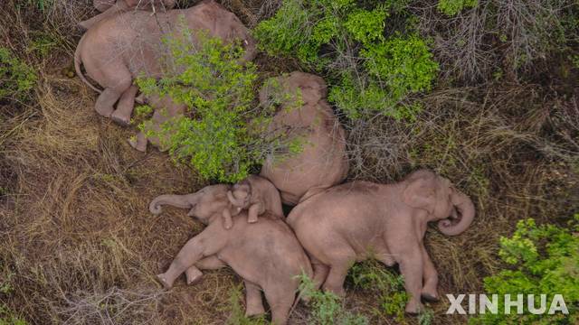 [쿤밍=신화/뉴시스]7일(현지시간) 중국 윈난성 쿤밍시 진닝현에서 야생 아시아 코끼리들이 쉬고 있다. 중국 당국은 지난달 20일 윈난성 시솽반나 자연보호구역에서 이동하기 시작했던 야생 아시아 코끼리 떼가 진닝현에서 잠시 멈췄으며 15마리 중 수컷 1마리가 무리에서 떨어져 나와 약 4km 떨어진 곳에 있다고 밝혔다. 윈난에서 주로 발견되는 아시아 코끼리는 중국에서 A급 보호를 받고 있으며 보호 노력 덕분에 그 개체 수는 1980년대의 193마리에서 약 300마리로 증가한 것으로 나타났다. 2021.06.08.