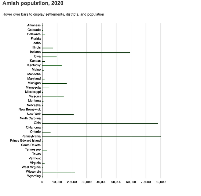 인디애나주 북동쪽 지역(엘크하트, 쉽시와나, 미들베리 등) 은 미국의 아미시 교도 32%가 거주하는 지역이다. 비영리 이민아동 권익보호기관인 영셍터의 2020년 연구 보고에 의하면 미국 전역엔 약 344,670명의 아미시 교도가 살고 있는 것으로 추정된다.