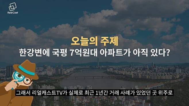 그런데 한강 인접한 지역에 서울 아파트 평균 가격보다 낮은 7~8억원대로, 그것도 국민평형으로 불리는 전용면적 84㎡에 진입할 수 있는 곳이 아직 남아 있다면 어떠신가요? 그래서 리얼캐스트TV가 실제로 최근 1년간 거래 사례가 있었던 곳 위주로 샅샅이 한번 뒤져봤습니다.