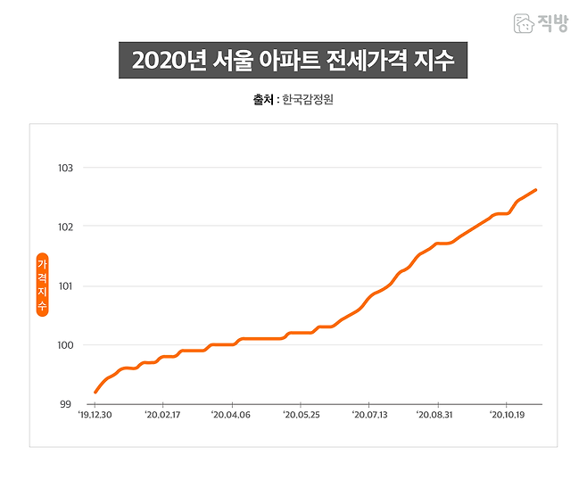 정부는 임대차 3법 때문이 아니라고 강변하지만, 아래 한국감정원에서 발표한 서울 아파트 전세가격 지수 그래프를 보면 임대차 3법이 시행된 7월 말 이후 전세가격 지수가 급등함을 알 수 있다.