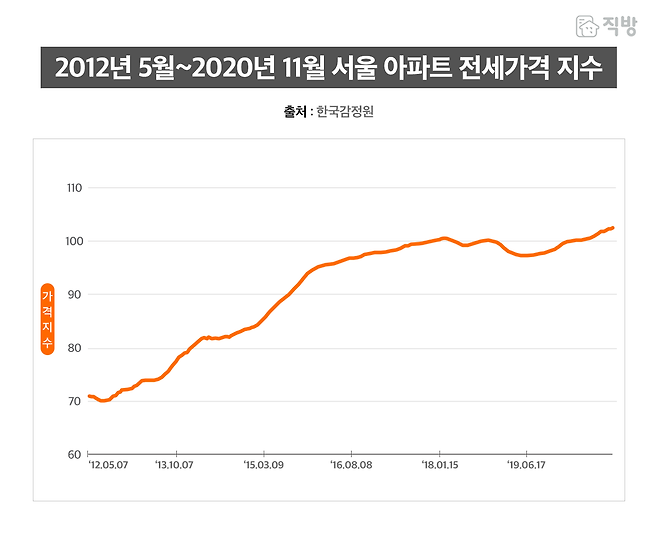 이제는 2012년에서 2020년까지 서울 아파트 전세가격 지수를 살펴보도록 하자. 참고로 필자가 인위적으로 만든 그래프가 아니라 한국감정원에서 제공하는 통계 그래프이니 믿어야 한다. 매매가격 지수와 달리 2012년부터 현재까지 꾸준하게 상승함을 알 수 있다.