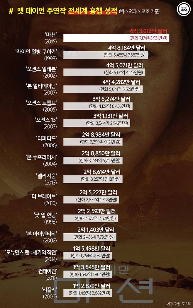 할리우드에 맷 데이먼이란 배우를 크게 알린 작품은 ‘굿 윌 헌팅’이고, 최고 흥행작은 6억 달러(한화 7,174억)를 돌파한 ‘마션’이다.