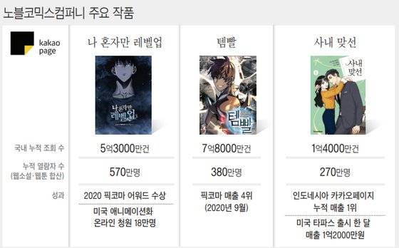 노블코믹스컴퍼니는 지금까지 웹소설 약 120편을 웹툰으로 제작했다. 이를 통해 'IP(지식재산권) 유니버스'를 구축하는 것이 목표다. 대표 작품은 '사내 맞선' '나 혼자만 레벨업' '황제의 외동딸' 등이며, '달빛조각사'는 게임으로도 확장했다. 하나의 IP가 다양한 매체로 퍼져 수익을 창출하는 OSMU(원소스멀티유즈) 영역에서 우위를 점했다. 이 모든 것의 시작은 웹소설이다.