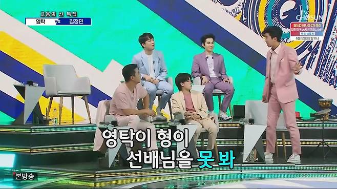 그런 영탁의 모습을 지켜보던 임영웅은 "영탁이가 선배님을 못 쳐다본다"면서 놀라워했다. 영탁은 김정민에 대해 이야기를 하면서도 계속 김성주 쪽을 쳐다보며 눈맞춤을 부끄러워하며 찐팬 면모를 드러내 눈길을 끌었다.