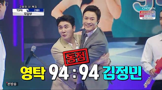 포옹으로 시작된 '우상과 대결'의 결과는 무승부였다. 김정민의 '굿바이 마이 프렌드(Goodbye my friend)'를 선곡해 정면 승부수를 던진 영탁과, 장현철의 '걸어서 하늘까지'로 분위기를 달군 김정민 모두 94점을 받은 것.