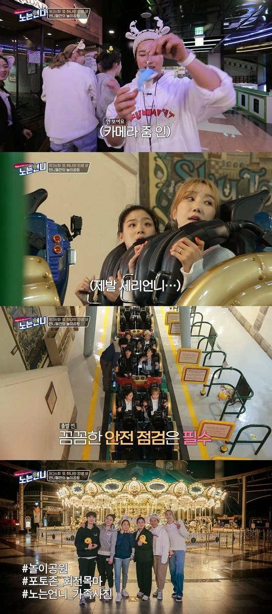 언니들은 첫 놀이기구로 바이킹을 골랐다. 박세리는 "예전에 몇 번 타봤는데 무서운 게 아니라 속이 안 좋더라"라며 정유인, 한유미, 남현희만 놀이기구에 태웠다.