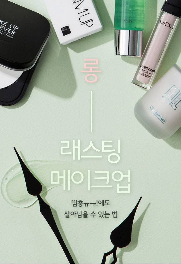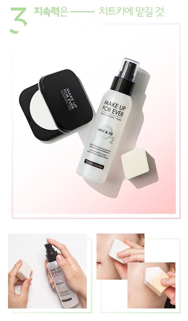 지속력을 위한 메이크업 픽서와 팩트는 진리의 아이템! 브러시로 파운데이션을 얇게 펴 바른 후 스펀지에 미스트 타입의 메이크업 픽서를 뿌려 피부에 한 번 더 밀착시킨다. 이 과정을 여러 번 반복하면 지속력을 업그레이드할 수 있다. 가벼운 제형의 파우더를 꼼꼼히 발라 베이스 메이크업을 마무리하는 과정까지 더하면, 머리카락이 달라붙지 않는 보송한 피부결이 올데이 유지된다.