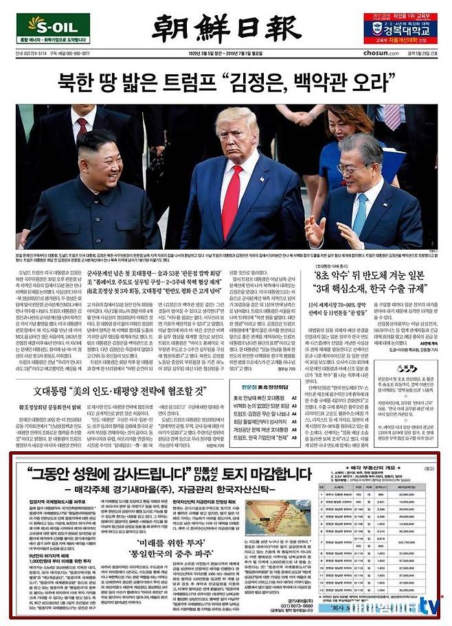 7월 1일 조선일보는 ‘북한 땅 밟은 트럼프 “김정은, 백악관 오라”’라는 제목으로 김정은 위원장과 문재인 대통령 사이에 서 있는 트럼프 대통령의 사진을 배치했습니다.