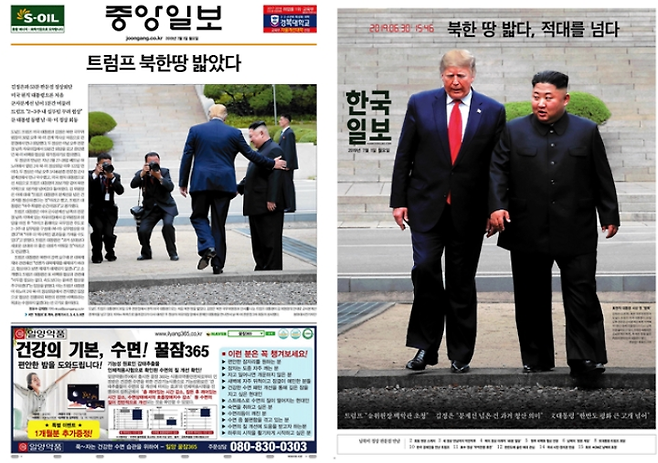 중앙일보는 ‘트럼프 북한 땅 밟았다’는 제목으로 이 만남을 다뤘습니다. 1면 기사 사진으로는 트럼 프 대통령이 판문점의 군사분계선을 넘는 모습을 먼 거리에서 포착한 이미지를 사용했습니다.
