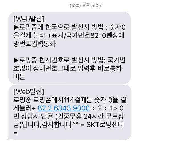 로밍 관련 문의에 대해서도 3사 모두 명쾌한 답변을 내주었다. 크게 다른 점은 SKT와 LGU+는 로밍 방법과 주의사항 등 추가적인 안내가 덧붙었으며, LGU+의 경우 고객이 실제로 여행 계획이 어떻게 되는지, 어떤 상품을 이용하면 좋을지까지 전반적으로 알려주었다. SKT와 LGU+는 로밍 관련 정보까지 볼 수 있도록 문자메시지를 보내왔다.