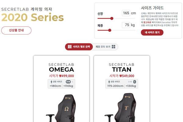 시크릿랩의 정식 홈페이지를 들어가 보면 구매 메뉴얼이 가장 먼저 눈에 띈다. 구매 메뉴얼을 이용하면 다양한 시크릿랩의 의자를 키와 무게 입력을 통해 손쉽게 선택할 수 있다. 모델은 각각 시크릿랩 오메가, 시크릿랩 타이탄이 있으며 해외의 경우 시크릿랩 타이탄XL 모델까지 있으나 XL모델은 국내에 정식 출시되지 않았다.