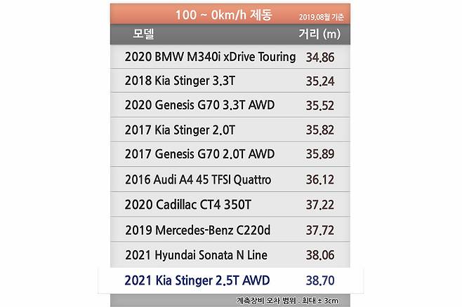 제동력은 어떨까? 100-0km/h 제동 성능을 확인한 결과, 최단 거리 기준 38.7m가 나왔다. 평균 제동거리는 39.19m, 최장거리는 39.58m로 순수 성능 유지 능력은 좋았다. 그러나 타이어에 의한 미끄러짐이 아쉬움을 남겼다. 테스트 모델은 4계절 타이어를 쓰고 있는데, 차와 어울리지 않은 성능을 냈다. 뒤에서도 얘기하겠지만 OE(출고용) 타이어 개발팀이 무슨 생각을 했는지 알 수 없다.