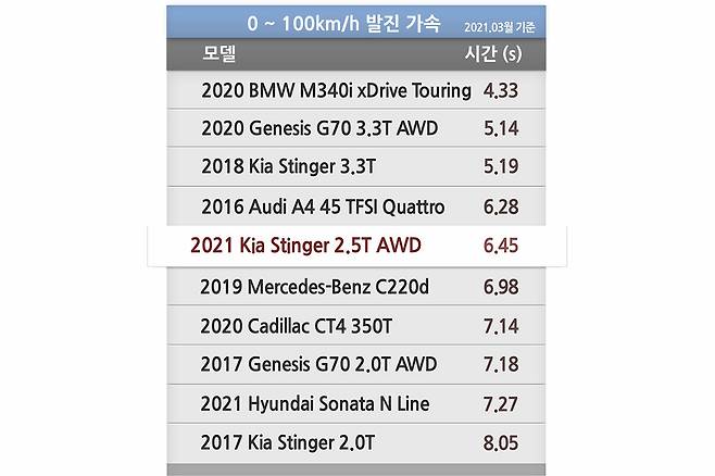 이제 가속력을 보자. 시험 결과 정지 상태에서 시속 100km까지 6.45초 만에 도달했다. 기존 스팅어 2.0이 8.05초를 기록했으니 충분히 좋은 성능이다. 테스트 모델은 일반유가 주유된 상태였는데 고급유로 변경하고 높은 접지 성능을 갖춘 타이어로 바꿔주면 5초대 후반 진입도 가능할 것 같다. 다만 런치 컨트롤도 조금 더 공격적이었으면 좋겠다. 런치 컨트롤과 일반 스톨 상태로 출발하는 것에 차이가 있나 싶을 정도이기 때문.