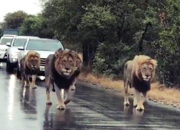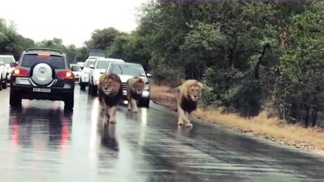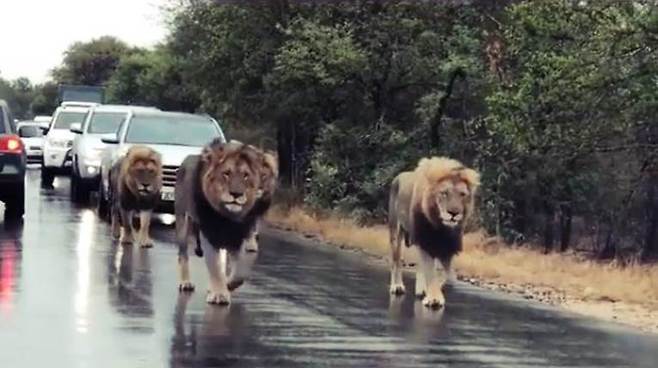 이 거대한 수컷 사자들로 인해 도로는 마비되었지만, 운전자들은 짜증은커녕 조용히 합죽히가 되었죠.
