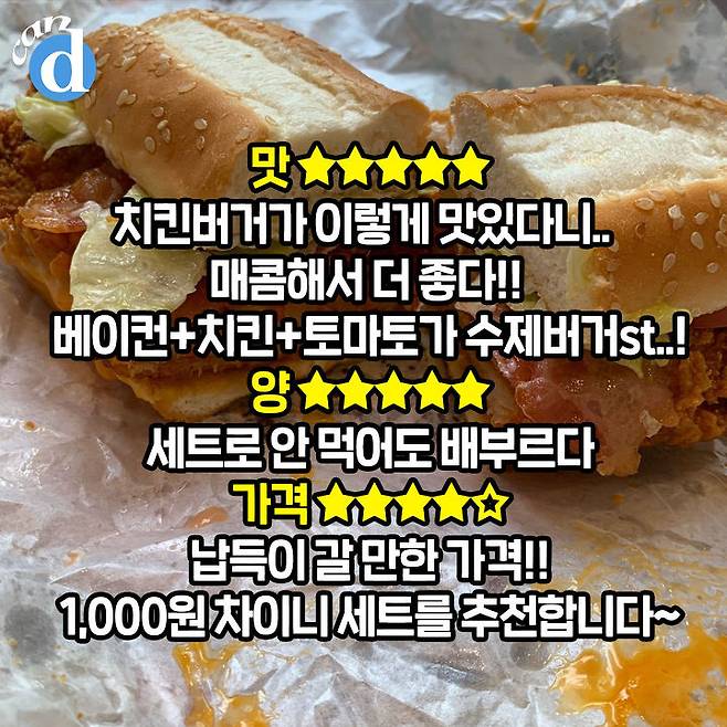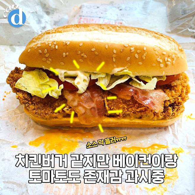 치킨버거에 베이컨+토마토 낀 먹자 수제버거를 뚝딱 먹은 것 같은 느낌.