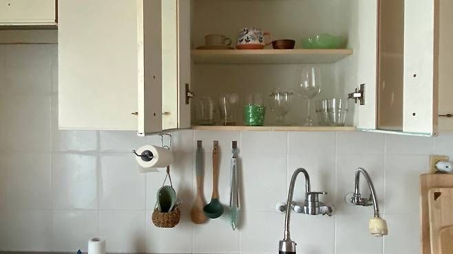 상하부장은 직접 페인트칠을 하고, 타일에는 타일 페인트를 칠했어요. 훨씬 깔끔해졌죠?