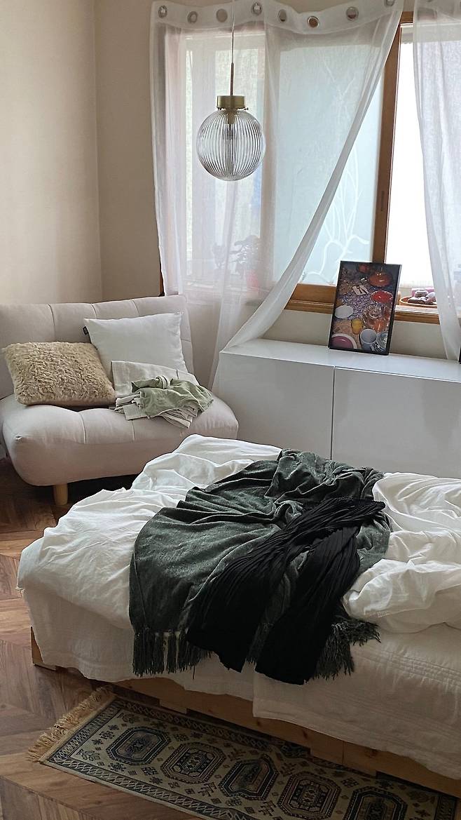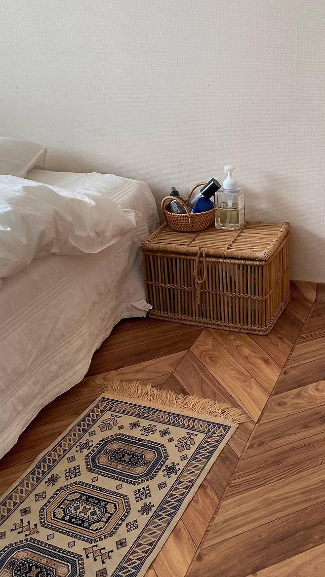 이 공간도 가장 먼저 '러그'를 깔아 노란 장판을 가려 인테리어 해보았어요. 채도가 낮은 침구와, 러그와 같은 톤의 수납박스를 두어 간단하게 꾸몄습니다.