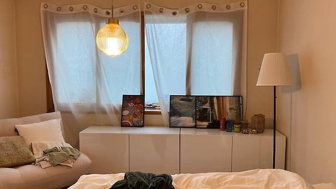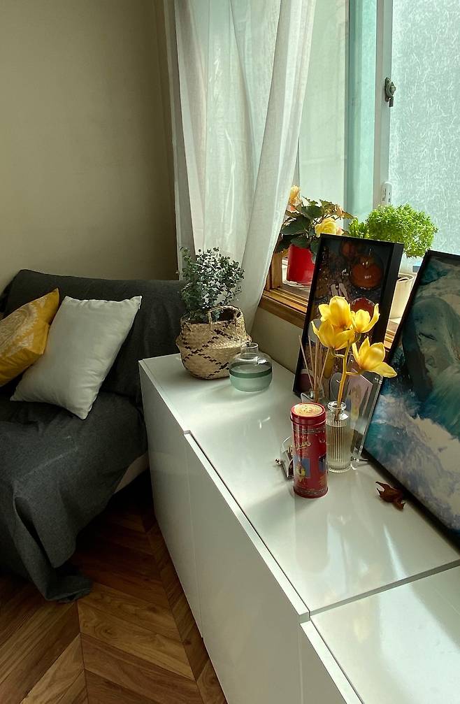 저는 창가 옆에 꼭 수납장 겸 벤치 역할을 할 수 있는 가구를 두고 싶었어요. 그곳에 앉아 창밖 구경도 하고 위에 소품들도 놓을 수 있어 다양하게 활용할 수 있을 것 같았거든요. 그래서 깔끔한 화이트 수납장을 창가에 두고, 심심하지 않도록 각종 액자와 식물 등을 두어 꾸몄어요.