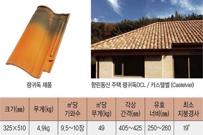 상부의 큰 골과 하부의 골이 만나는 부분에 모서리 꺾임을 준 랭귀독 DCL이 있다. 이 제품은 프랑스 남부 인근의 지질학적으로 동파가 나지 않아 희귀한 흙의 매장지인 St. Papoul에서 채굴된 점토를 소성해 제작한다. 입체적인 그림자 효과가 있는 기와로 전통 골기와 형태의 시공이 가능하다. 랭귀독 DCL과 같은 재료로 만들어지지만 각상간격과 너비가 좁아 시공할 때 ㎡당 기와를 2장 정도 더 사용하는 DC12 제품도 있다. DC12 제품은 상대적으로 크기가 작고 무게가 가볍다. 이 제품은 S자 모양의 판부로 프랑스 남부의 전통적인 U형 기와의 느낌을 연출해 고상하면서 세련된 멋을 뽐낸다.