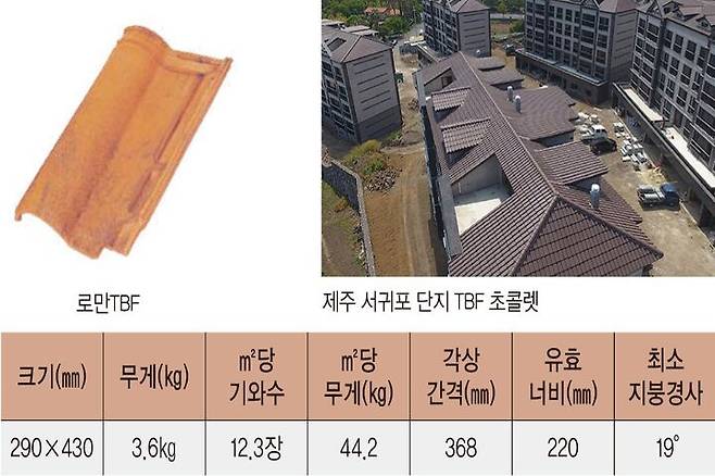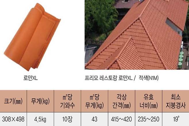 스페니쉬 기와로 로만 TBF는 아시아 전역에 공급되고 있는 기와다. 이 제품은 다채로운 색상으로 구성돼 있어 가장 다양한 풍미를 자랑해 현재 전원주택 시장에서 많이 시공되고 있다. 로만 XL은 로만 TBF의 안정감은 유지하면서 경제적 효과를 구현한 제품이다. 이 제품은 특유의 선이 굵어 시원시원하며 ㎡당 9.5장을 사용해 자재비용의 절감 효과가 있다.