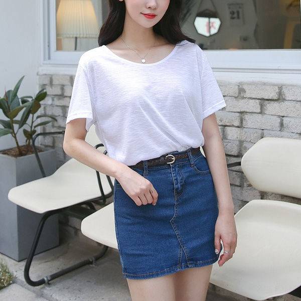 이렇게 흰 반팔티에 청치마를 입는 거죠. 위에 남자 코디 1과 함께 입으면 커플룩 완성! 청량감이 뿜뿜하는 사랑스러운 코디네요.