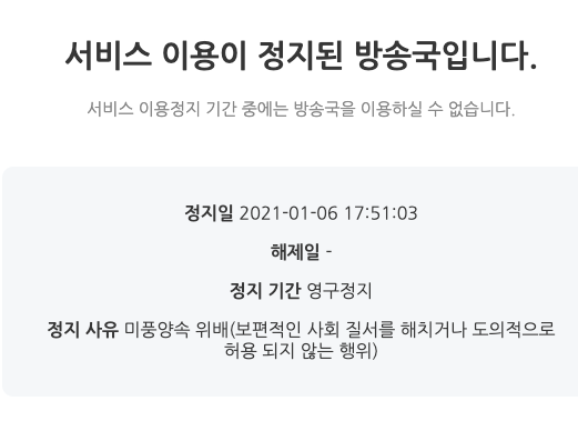 결국 아프리카TV도 그의 채널을 영구정지 시키며 징계에 나섰다.