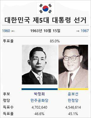 전역과 동시에 민정에 참여한다고 발표한 박정희는 곧바로 사전 창당된 민주공화당에 입당해 제5대 대통령 선거에 출마했다. 선거에서 박정희는 46.6%를 획득해 45.1%를 획득한 윤보선에게 1.5% 차로 간신히 승리했다. 두 후보의 표차는 15만 6026표, 한국의 대통령 선거 사상 가장 근소한 표차였다.