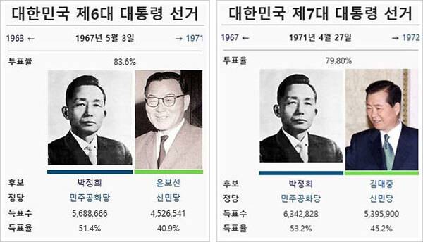 1967년 제6대 대선에서도 승리한 박정희는 1969년, 국민 투표를 통해 제6차 개헌안(삼선개헌)을 통과시켜 3선의 기반을 만들었다. 1971년 박정희는 제7대 대통령 선거에서 신민당의 김대중 후보를 누르고 삼선에 성공했다.