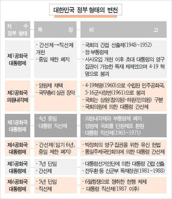 개정헌법은 제2공화국의 의원내각제를 폐지하고 부통령을 없애는 등 제1공화국의 대통령중심제보다는 미국식에 가까운 대통령중심제로 바꿨다. 그러나 대통령은 긴급명령권, 긴급재정·경제처분권 등 강력한 권한을 가졌고 사실상 정당 지도자로 정당을 통해 국회를 지배하는 ‘행정부 우월주의’의 대통령중심제였다.