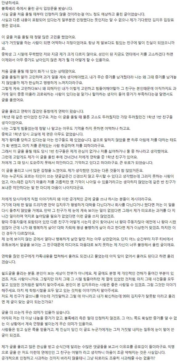이어 "중학생 그 시절에 무력했던 저와 지금 제가 크게 다르지 않다. 성인이 된 지금도 엔터에서 저를 고소하겠다 하면 이제와서 아무 증거도 남아있지 않은 제가 뭘 더 어떻게 할 수 있을까요"라며 "그 친구는 본인때문에 아직까지도 과거에 일이 종종 떠올라 괴로워하는 사람이 있다는걸 알기나 할까하는 생각이 들었다"며 처음 폭로글을 올리게 된 계기를 설명했다.