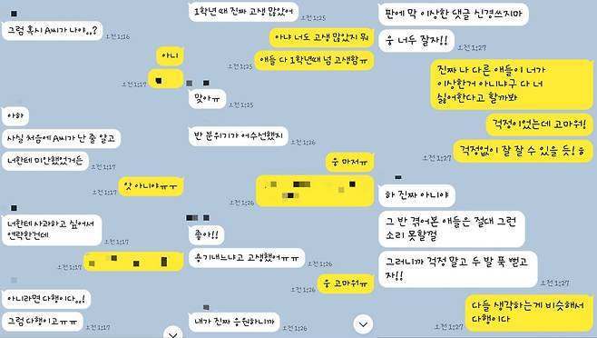 또 A씨는 글을 올린 이후 연락이 끊겼던 동창에게 연락이 왔다면서 함께 나눈 대화 내용을 공개했다. 카톡 내용 속 다른 동창 B씨는 A씨에게 "너한테 사과하고 싶어서 연락했다"며 "그 반 겪어본 애들은 절대 그런 소리 못할 걸"이라고 A씨에게 공감했다.
