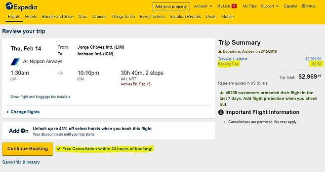 24시간 내 무료 취소가 가능한 사이트로는 ‘익스피디아’가 있습니다. 다만 한국 사이트가 아닌 해외 기준의 사이트로 이용해주셔야 합니다. 항공편을 검색할 때 ‘Additional Options’를 클릭한 후 ‘Refundable flight’에 체크를 하면 24시간 내 무료 취소가 가능한 티켓들로만 조회가 됩니다.
