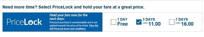 코파항공에는 ‘Price Lock’이라는 서비스가 있습니다. 사이트에 뜨는 항공편의 현재 가격을 24시간동안 무료로 유지해주는 것인데요. 항공편을 골라 티켓을 예매하는 창에서 ‘1 DAY Free’를 선택하면 이름 등의 정보만 입력한 채 결제를 하지 않아도 본인의 명의로 24시간 동안 티켓이 홀딩됩니다. 24시간 이내에 접속해서 결제 정보를 입력해야 티켓 구매가 완료되는 것이기 때문에 따로 환불을 위한 절차도 필요하지 않으며, 자동으로 취소가 됩니다.