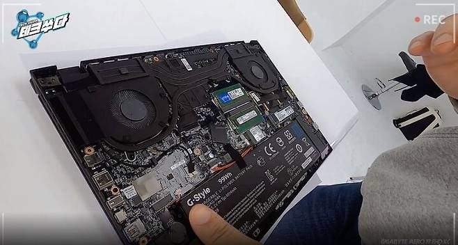 뒷판을 뜯어보니 양쪽으로 된 듀얼 쿨링팬과 5개의 히트파이프라 발열 관리를 하고요. SSD 슬롯은 두 개에 램 슬롯도 2개로 구성됐습니다. 배터리 용량이 99W로 기내 탑재 가능한 최대 용량(100W)에 아슬아슬하게 걸친 게 눈에 띄네요. 별도 어댑터 연결 없이 작업하더라도 5~6시간가량 전원 상태가 지속된다고 합니다.