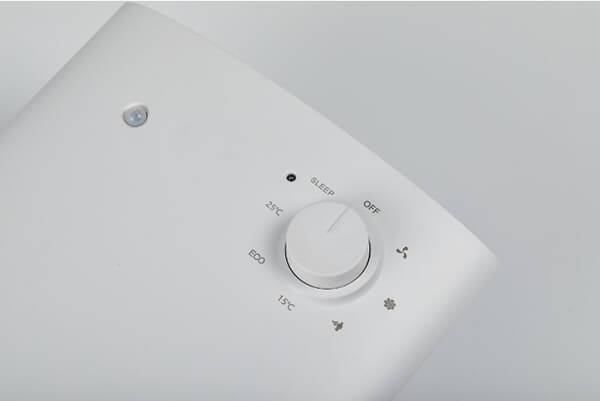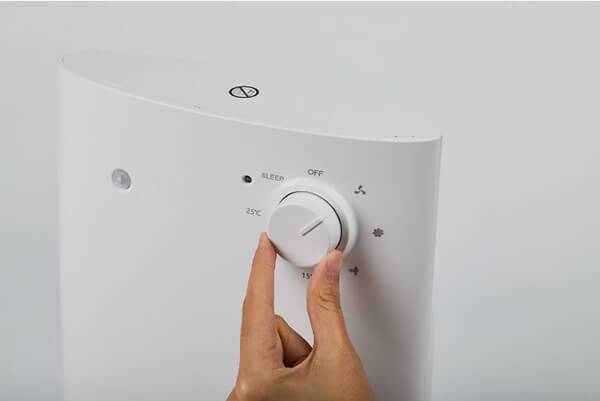 상단부에는 인체감지센서와 전원 표시등, 다이얼이 탑재돼있다. 다이얼은 한 번에 45도씩 움직이는데, 전원 OFF를 기준으로 우측으로 돌리면 약온풍, 강온풍, 인체감지기능, 15도 설정, 에코모드, 25도 설정, 수면모드를 이용할 수 있다. 물론 반대로 돌리는 것도 가능하다.