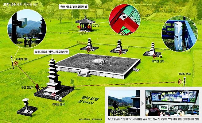 같은 시각 보령시청 CCTV 통합관제센터. CCTV 화면 수십 대를 직원들이 지켜보던 중 성주사지 현장이 팝업(작은 화면이 확대되는 것)으로 크게 떴다. 누군가 오층석탑에 접근했다는 위험을 적외선 센서가 감지한 것. 동시에 보령시청 담당 학예사 휴대전화에도 ‘성주사지 경보’ 문자가 울렸다. CCTV나 센서가 불법 침입을 인지해 통합관제센터를 통해 관내 경찰관과 문화재 담당자에게 실시간 상황이 전송되는 시스템이다.