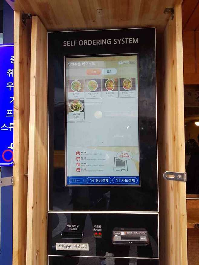 주문은 식당 밖에 있는 키오스크를 통해서 하고, 기다리고 있으면 자리가 났을때 번호를 부릅니다.