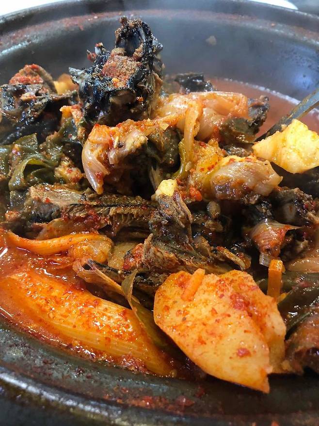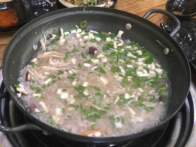 구이를 먹고 나면 남은 부위와 강원도 감자를 듬뿍 넣고 끓여낸 얼큰한 오골계 탕도 함께 제공되는데 감자를 으깬 자작한 국물에 밥을 비벼 먹으면 맛있다는 사장님의 팁...