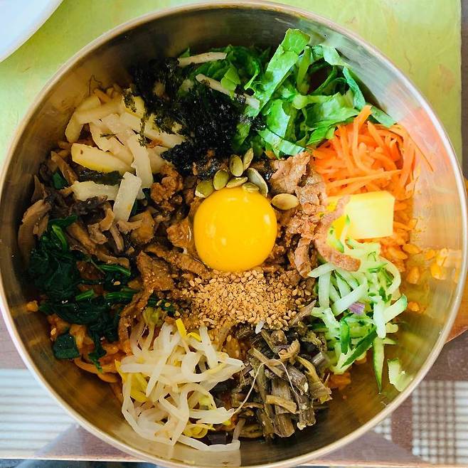 놋쇠 그릇에 이미 비벼진 밥위에 고명이 얹어 나오네요. 감칠나고 재료와 밥이 잘 어우러진 고급스런 맛입니다.